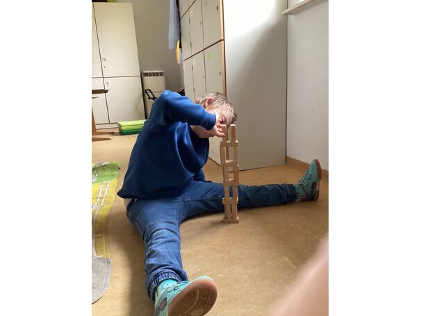 Im Nebenraum haben wir einen Spielteppich. Darauf bauen wir entweder hohe Türme oder Bauernhöfe und Reiterhöfe auf.